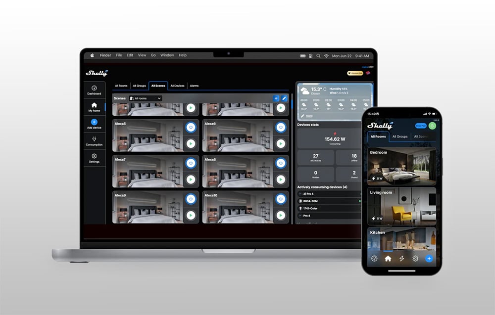 Shelly Smart Control este o aplicație gratuită care vă permite să gestionați complet dispozitivele Shelly, să monitorizați consumul de energie și să controlați costurile în timp real. Cu o interfață clară, puteți urmări performanța dispozitivelor individuale, crea automatizări și primi notificări privind anomaliile energetice. Aplicația funcționează pe smartphone-uri și computere, iar accesul la Shelly Cloud vă permite să vă controlați instalația de la distanță de oriunde.
