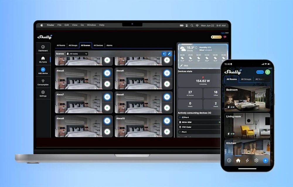 Controlerul vă permite să gestionați de la distanță jaluzelele, storurile, copertinele sau alte nuanțe prin intermediul smartphone-ului, tabletei, computerului sau sistemului de automatizare a locuinței - atât local prin Wi-Fi, cât și de la distanță prin cloud. De asemenea, puteți seta programe de funcționare adaptate la răsăritul și apusul soarelui și puteți crea scenarii inteligente în cadrul funcției Smart Scenes. Ca urmare, oblonul Shelly poate funcționa cu alte dispozitive Shelly pentru a crea automatizări complexe pentru întreaga casă, care îmbunătățesc viața de zi cu zi și economisesc energie.